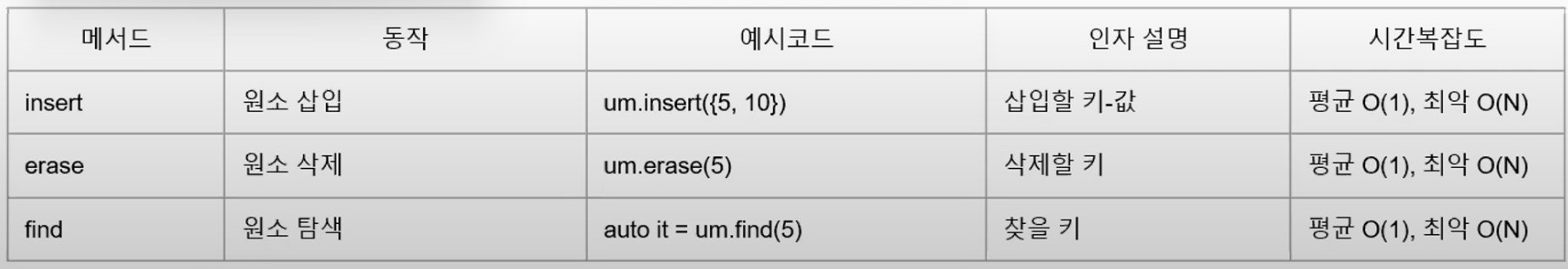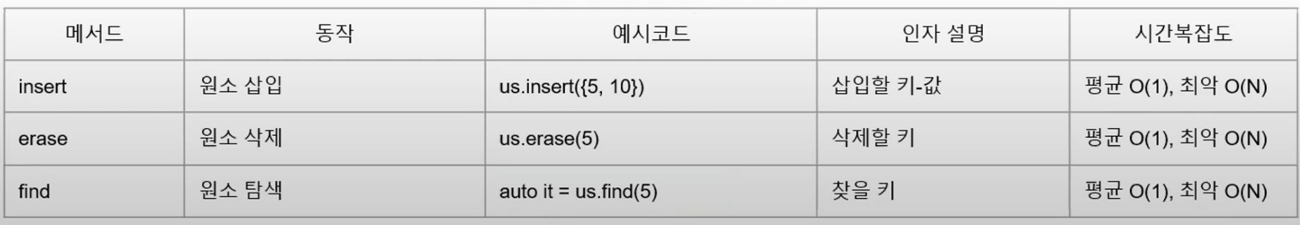 => 원소가 해시 테이블로 관리되어 자동정렬이 안됨.