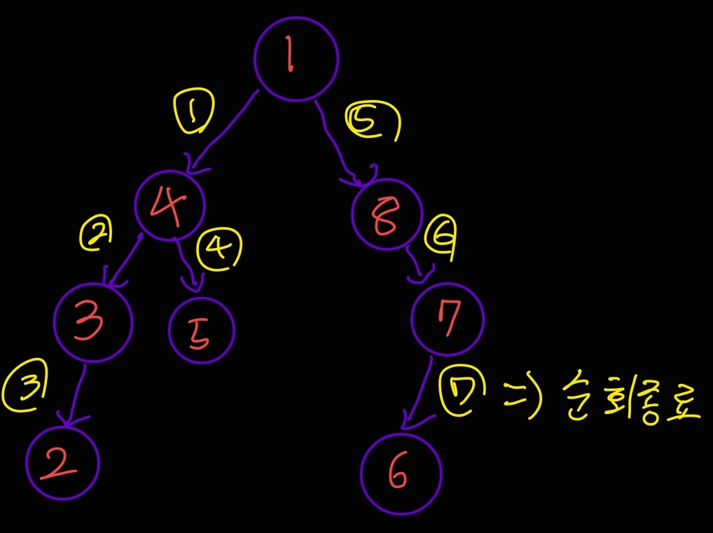 7 ⇒ “8”은 왼쪽 자식이 없으므로 “7”건너뛰고 “6”이 “7”의 왼쪽 자식이므로 “6”방문. 후에 마지막으로 “7” 방문