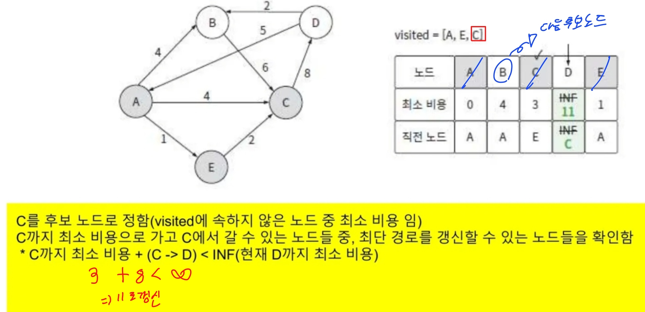 - 인접 노드 C 업데이트: